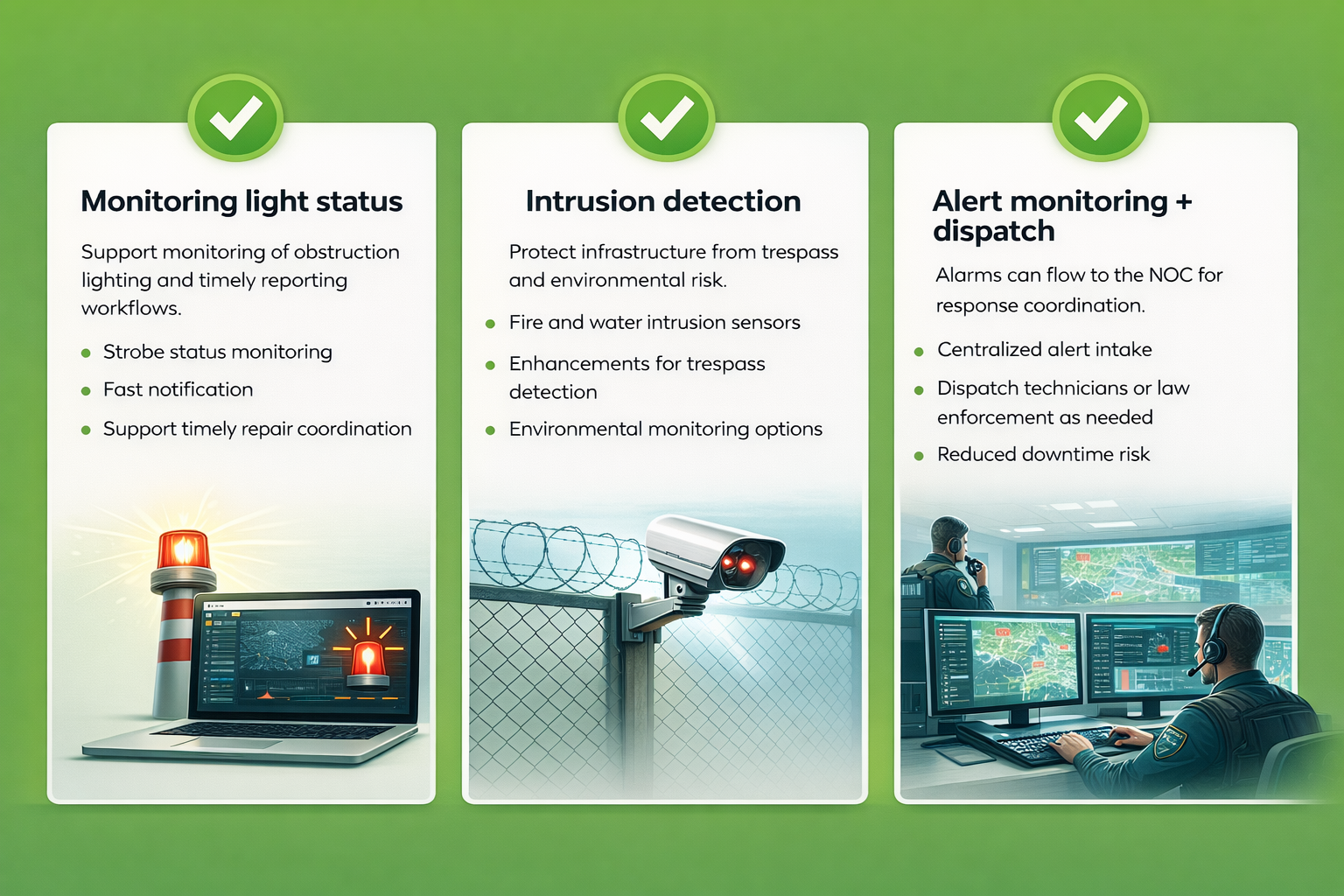 Towers can have monitoring and reporting requirements. Tridon’s NOC can monitor key tower infrastructure 24/7, notify you when issues occur (including obstruction lighting), and dispatch tower technicians to resolve problems quickly.