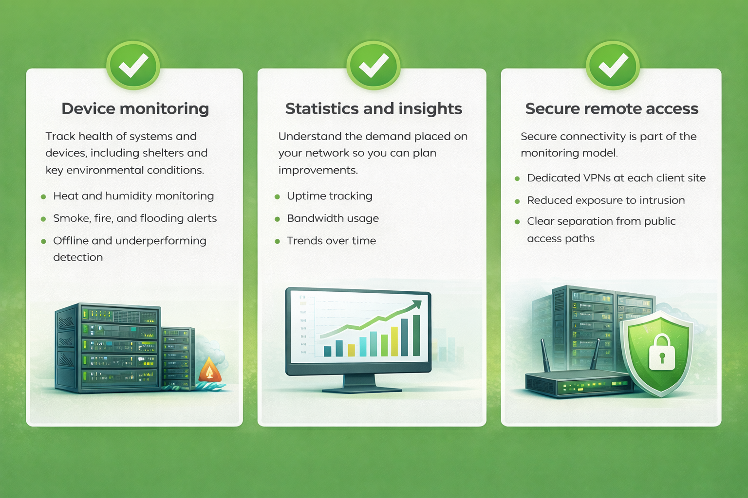 Tridon’s Network Operations Center (NOC) can remotely analyze and diagnose issues across wired and wireless communications equipment before they escalate. Think of monitoring as preventive maintenance—with alerts, reporting, and after-hours support.