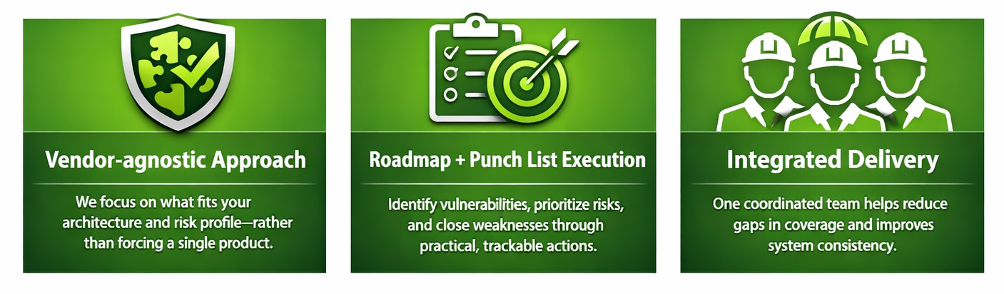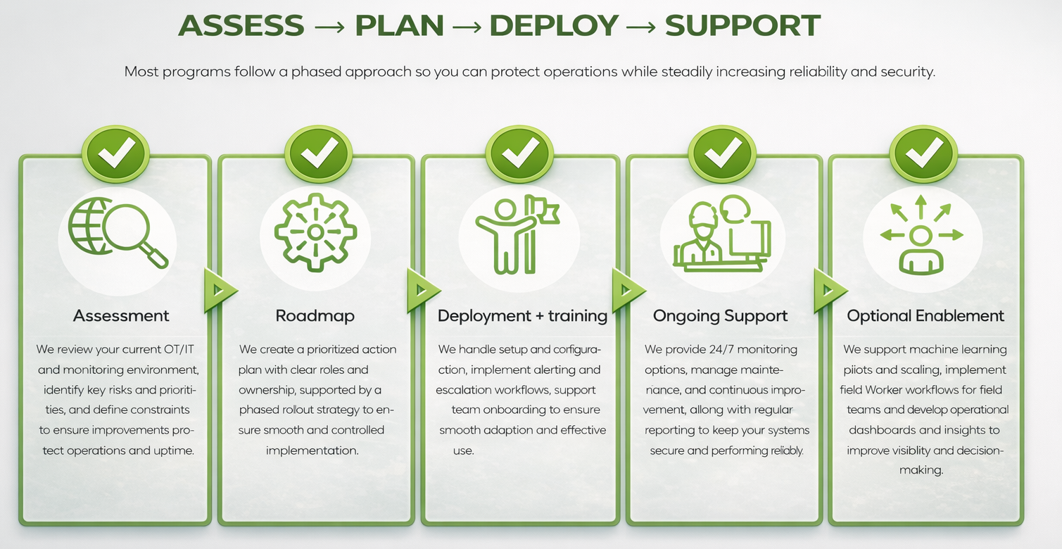 Managed services can include ongoing OT systems management focused on sustained reliability and security maturity, plus support for security and compliance over time.
