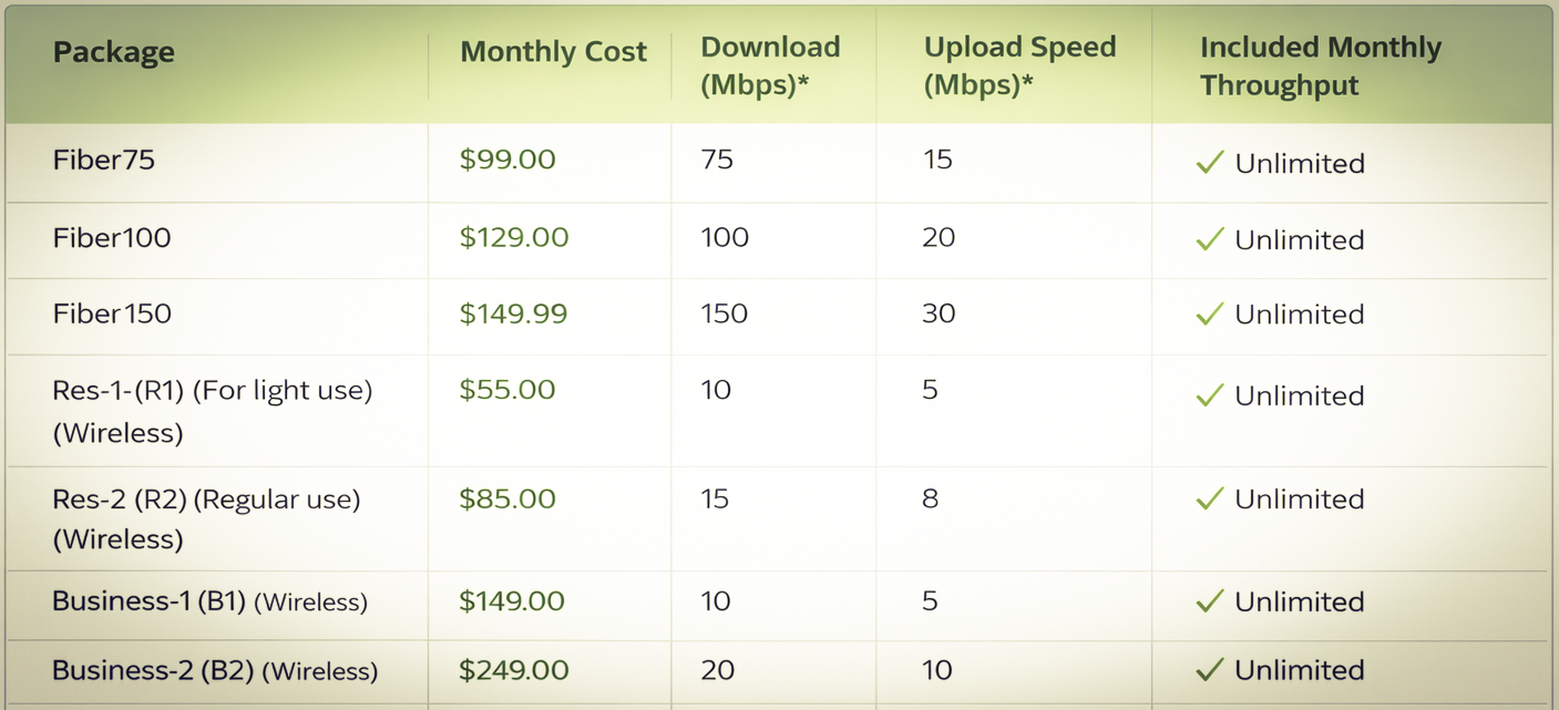 We offer flexible plans based on your location and needs. Speeds and availability may vary depending on your area.