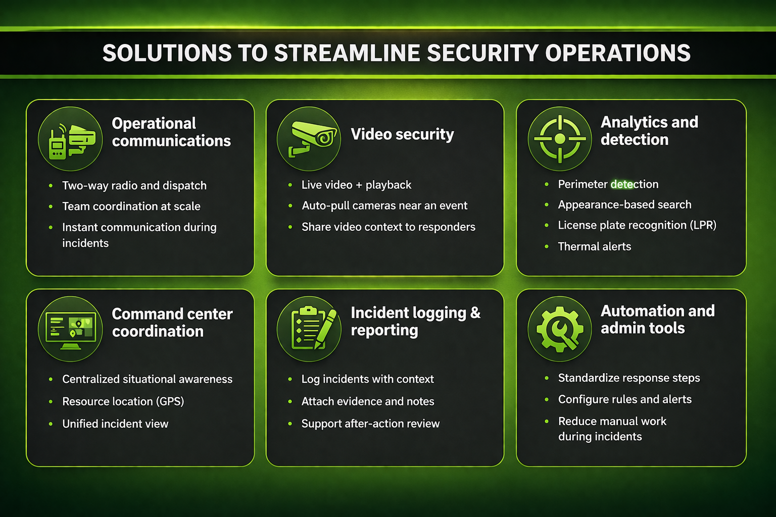 Many organizations have separate systems for radio, video, access control, alarms, and reporting. Our systems focus on connecting these tools so teams share the same context and can respond with less friction.